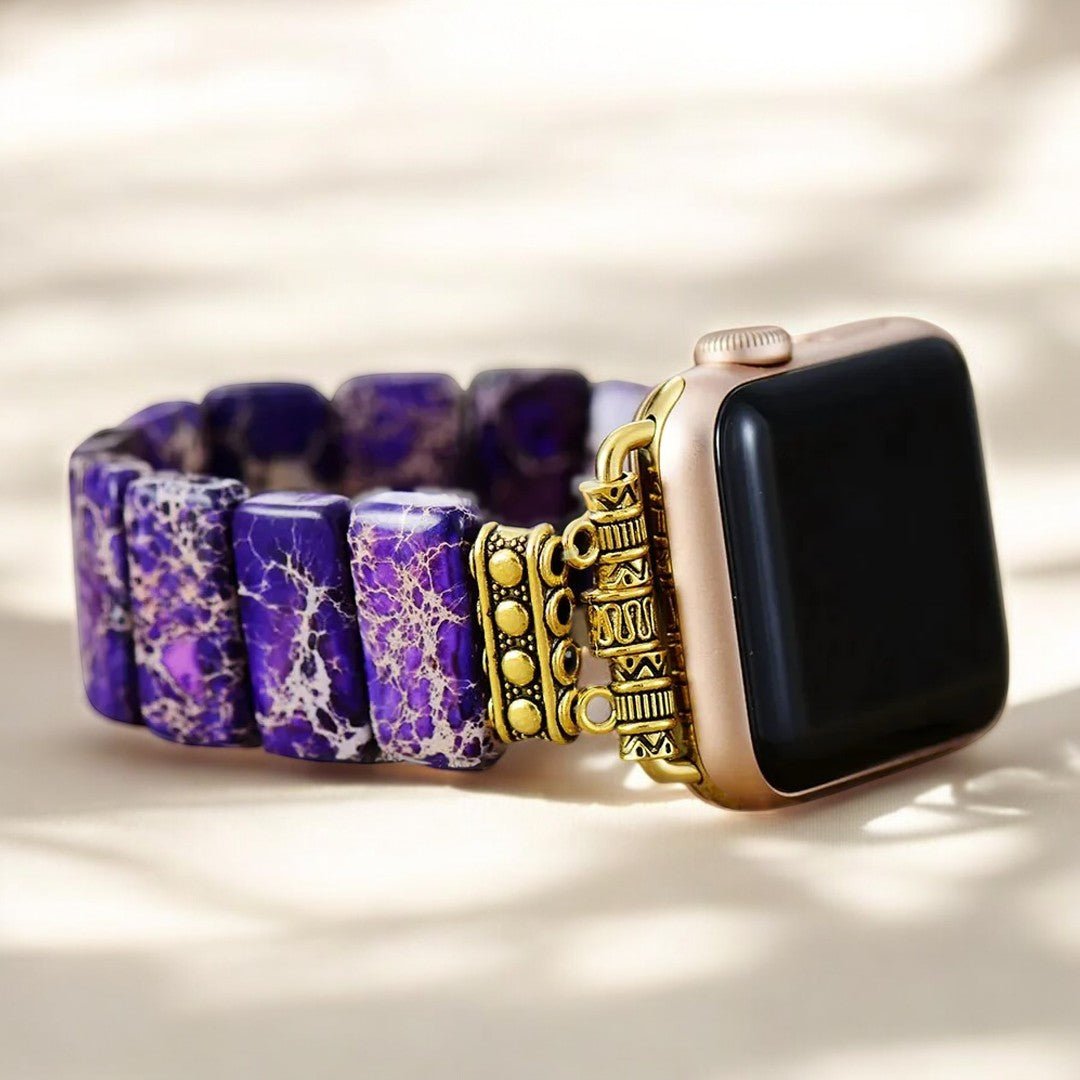 The Indigo Tibetan Jasper Stretch Apple Watch Strap features calming stonework believed to offer protection and ease anxiety. Jasper helps promote relaxation, organization, and inner peace.