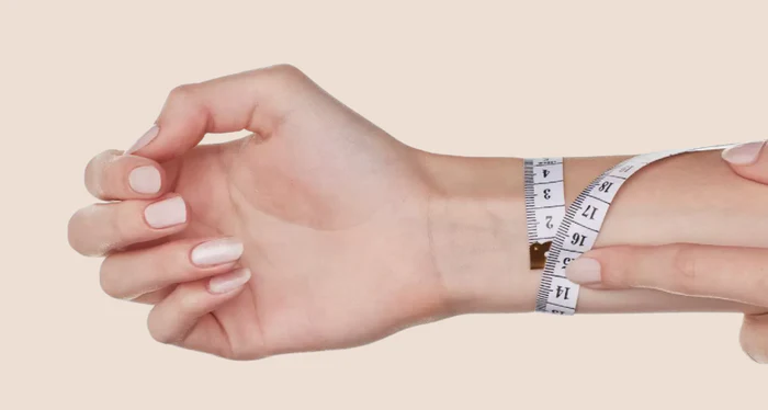 With your palm open and facing up, wrap the measuring tape around your wrist, just above your wrist bone. Note down measurement of your wrist size.