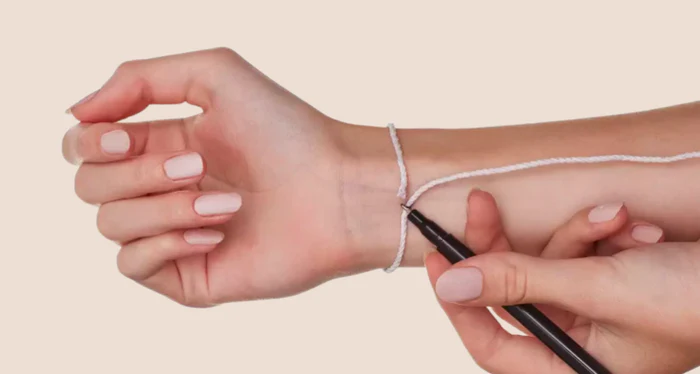 With your palm open and facing up, wrap the string or strip of paper around your wrist, just above your wrist bone. Mark where the ends meet with a pen or a marker. Next, lay the string or piece of paper flat and measure it to where you've made the mark to find your wrist size and note it down.